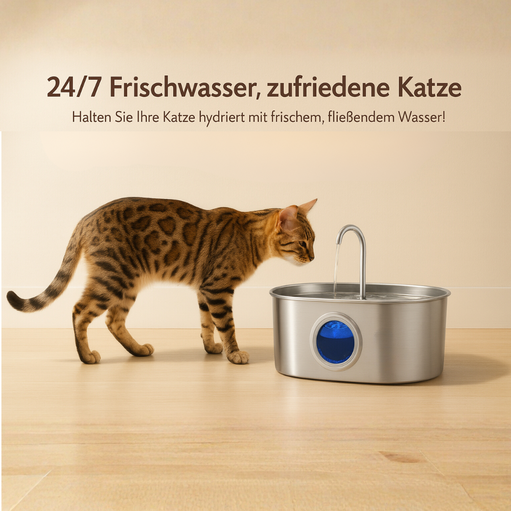 Deine Katze verdient frisches, sauberes Wasser – rund um die Uhr. Der Ambaro AquaBrunn sorgt mit seinem leisen Zirkulationssystem und der hochwertigen Edelstahlverarbeitung dafür, dass das Wasser immer in Bewegung bleibt – frei von Bakterien, Kalk und unangenehmen Gerüchen.